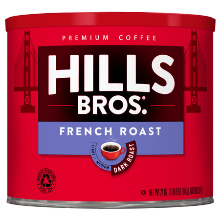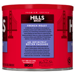 A range of Hills Bros coffee products are displayed against a red background featuring a bridge. The products include a can of ground coffee, a bag of beans, and a box of K-Cup pods.