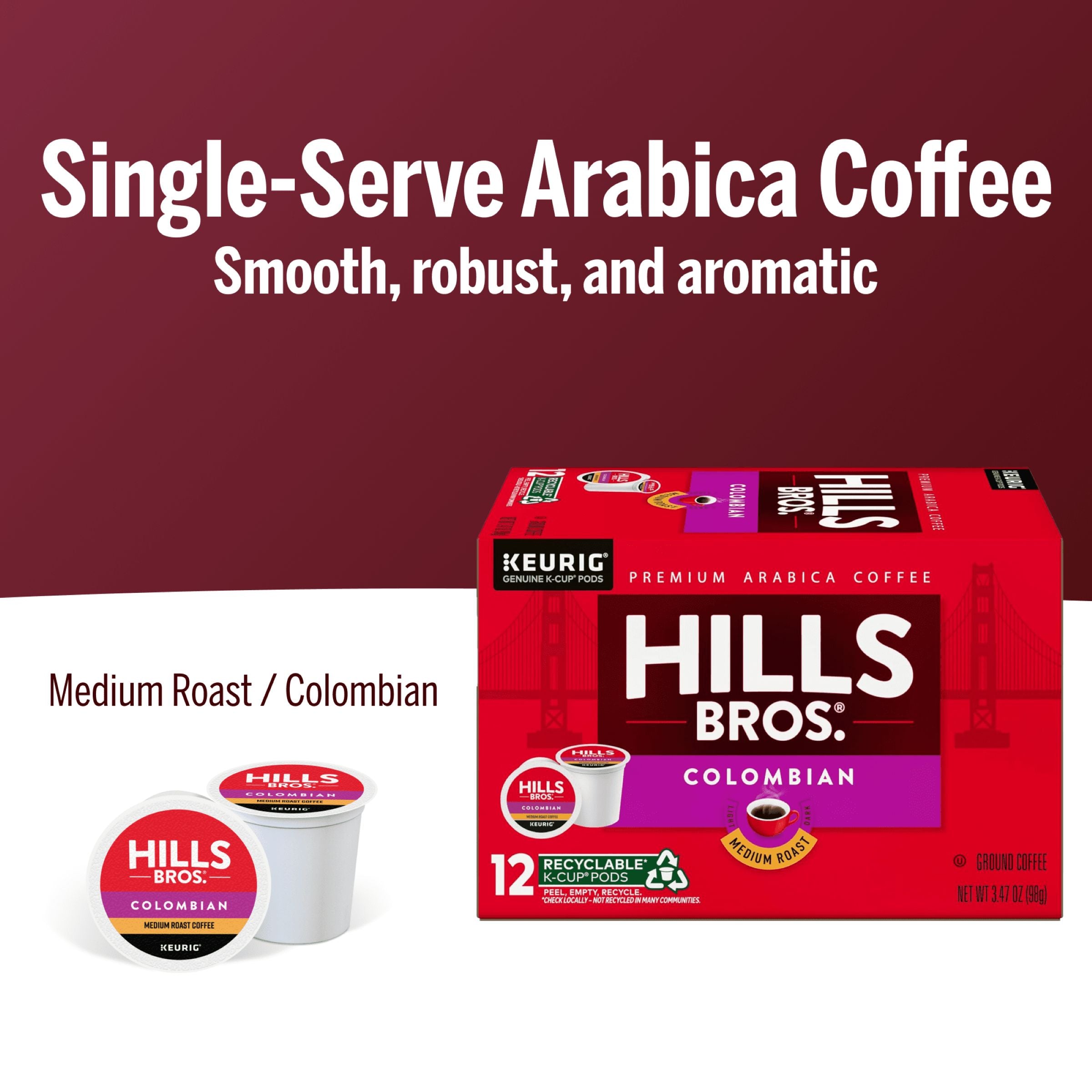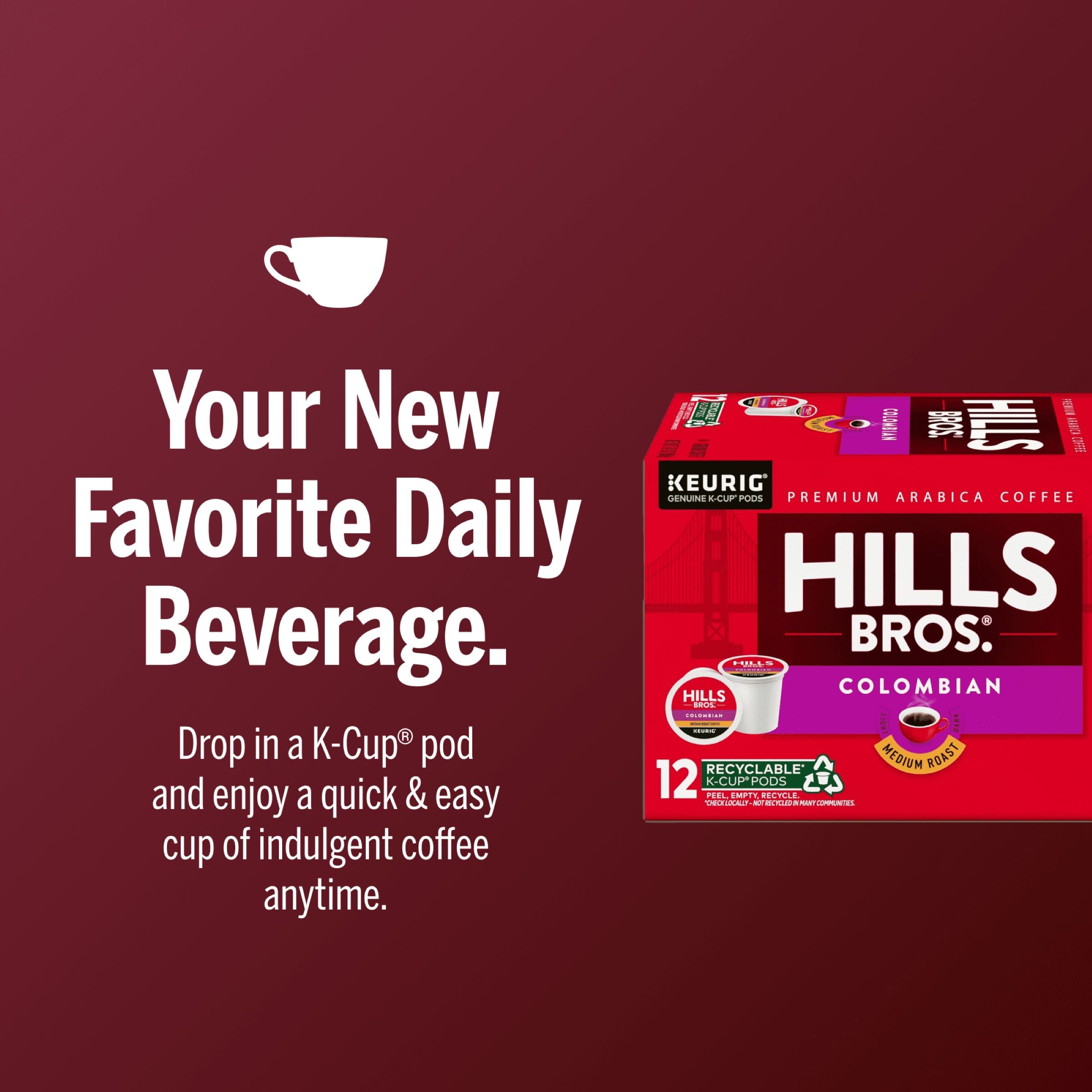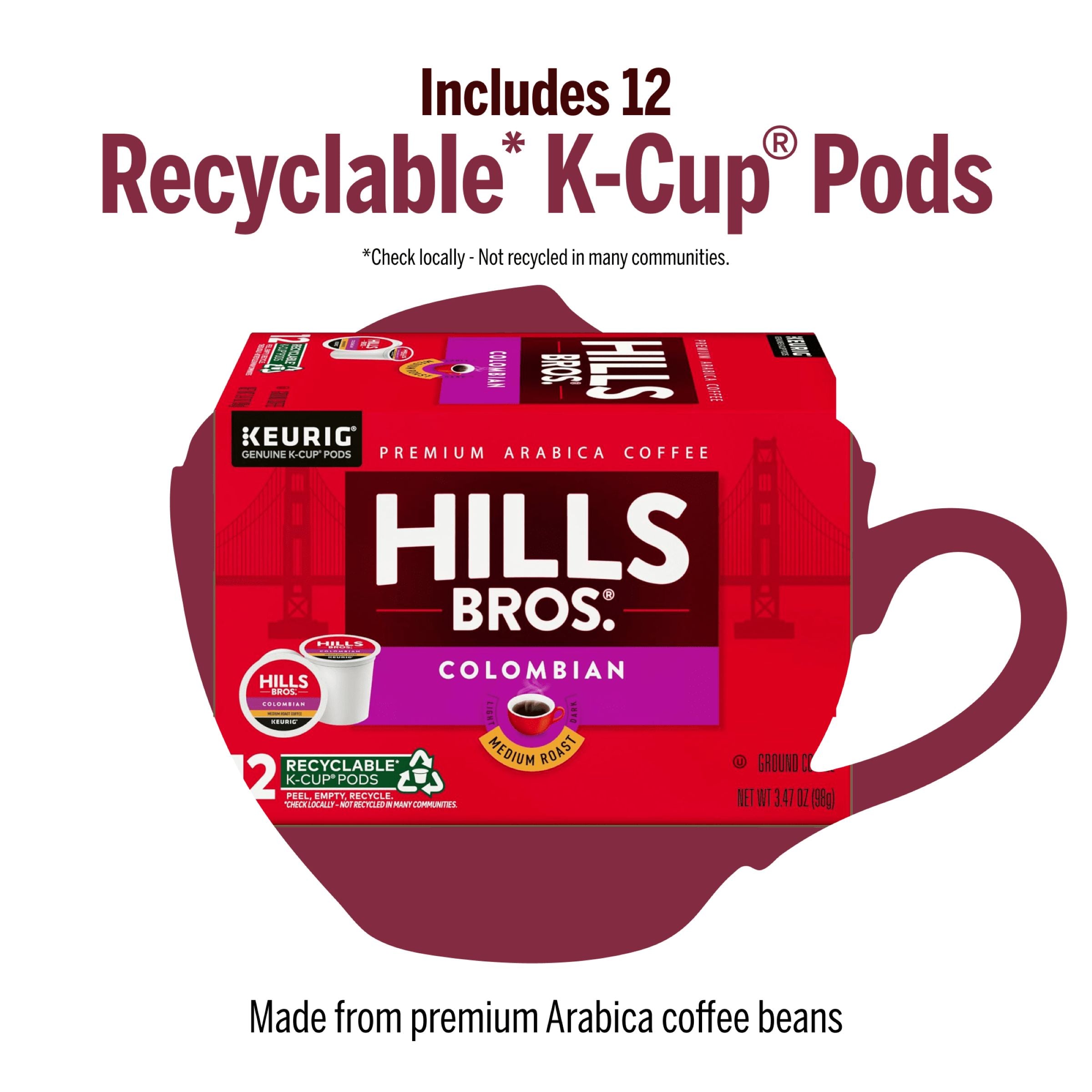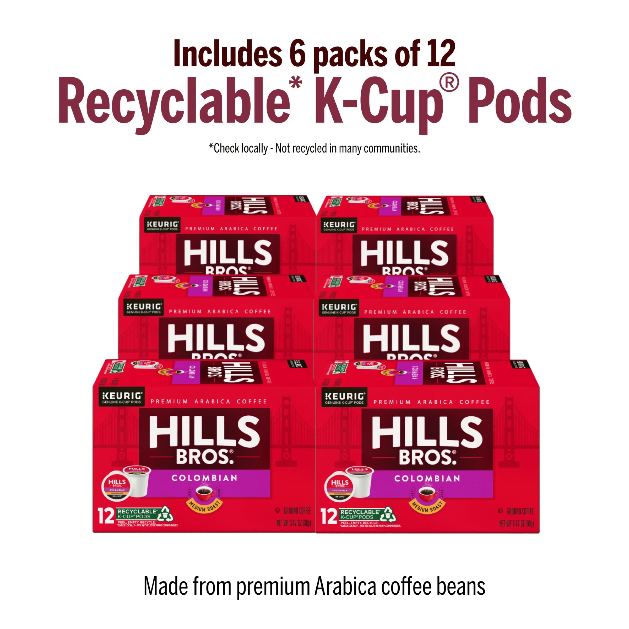 Each Hills Bros.® K-Cup® pod is filled with premium, freshly ground coffee beans and is compatible with all Keurig® brewers. Simple. Delicious. And recyclable.* Enjoy the same great-tasting coffee you know and love, and when you're done, just peel, empty, and recycle.